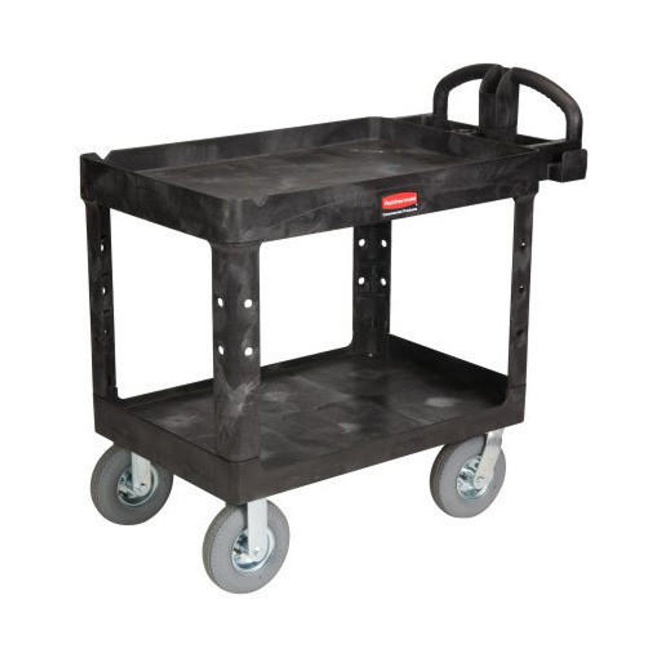 Perfect for transporting equipment and heavy loads in any environment. Sturdy structural foam construction won't rust, dent, chip or peel. Rounded corners protect walls and furniture. Lightweight and maneuverable. Large, non-marking pneumatic casters. Dimensions: 45-1/4"L x 25-7/8"W x 33-1/4"H. Load capacity: 500 lb. (226.8 kg).Questions about 2 Shelf Utility Cart w/ Pneumatic Casters, Black?