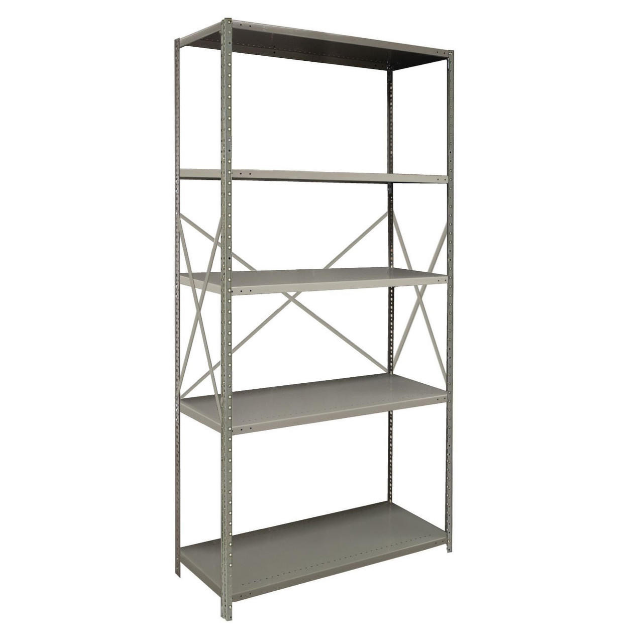 Republic's open shelving units are ideal for economical, general purpose storage. They allow light to penetrate a storage area and allow for free air flow around stored materials. Standard side and back sway braces made from 12-gauge steel are used to stabilize open shelving units. Braces are punched to attach to upright posts with nuts and bolts. Units include all necessary hardware.Questions about 2000 Series 48"w x 12"d x 85"h Open Steel Shelving Angle Post Starter with 5 Shelves, Dove Gray?