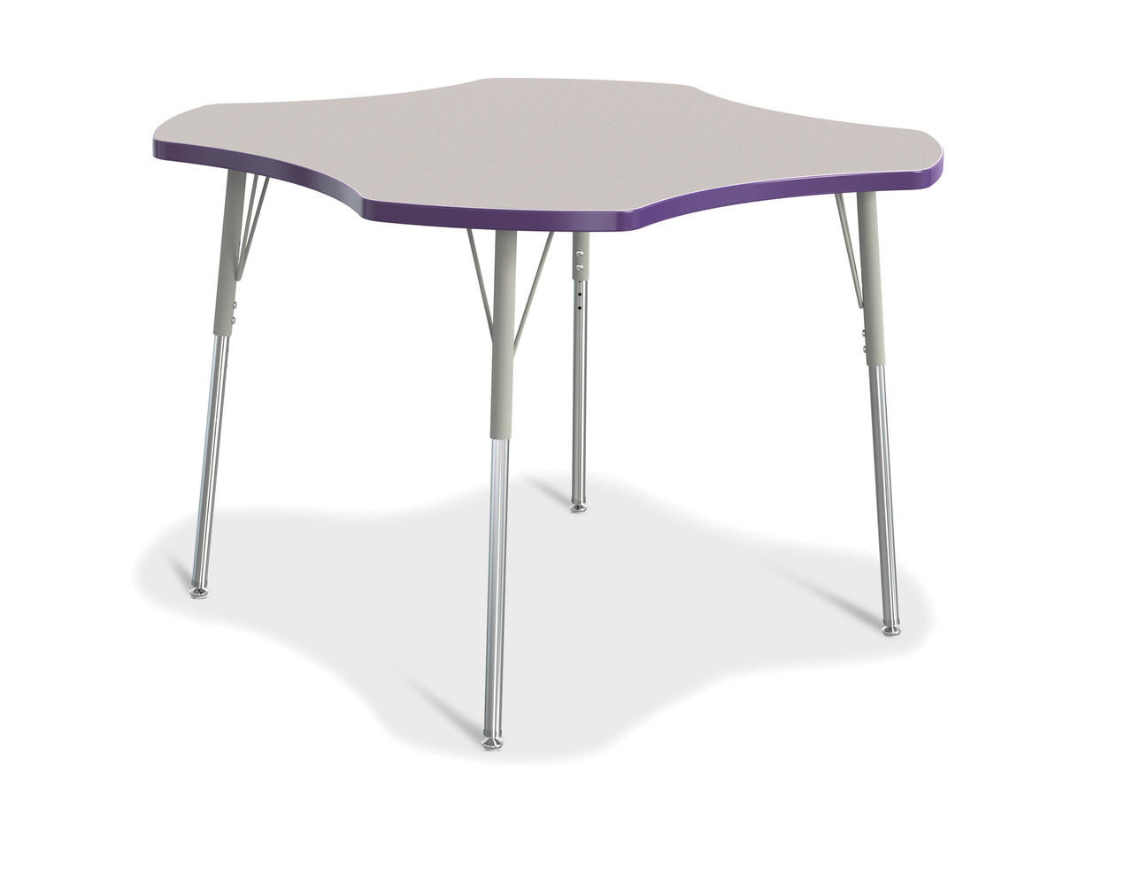Seating in a fun shape! Accommodates up to 4 chairs. The legs feature glides that reduce noise, prevent snags, and resist rust. Freckled gray tabletop with purple TRUEdge and gray legs.