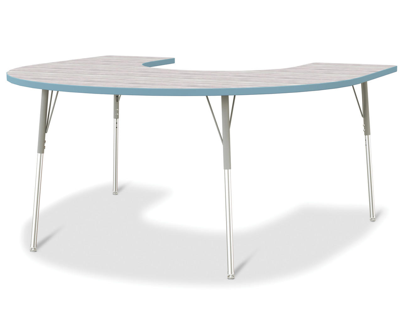 Children can center around an educator easily with horseshoe tables. Accommodates up to 7 chairs. The legs feature glides that reduce noise, prevent snags, and resist rust. Driftwood Gray tabletop with Coastal Blue TRUEdge and Gray legs.