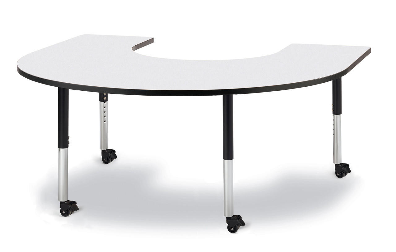 Children can center around an educator easily with horseshoe tables. Accommodates up to 9 chairs. The legs adjust from 20" to 31" high, are 2" thick, and feature heavy-duty casters. Freckled gray tabletop with black TRUEdge, black legs, and black casters.