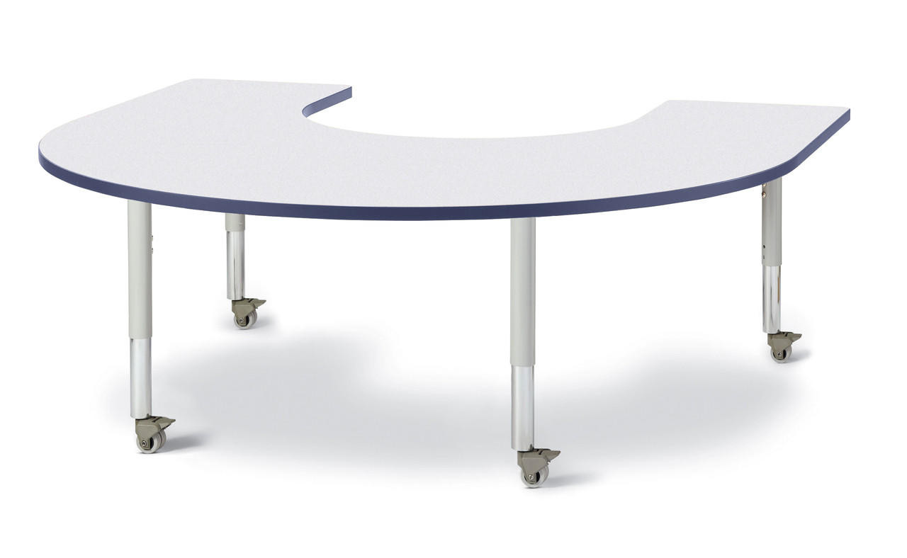 Children can center around an educator easily with horseshoe tables. Accommodates up to 9 chairs. The legs adjust from 20" to 31" high, are 2" thick, and feature heavy-duty casters. Freckled gray tabletop with navy TRUEdge, gray legs, and gray casters.