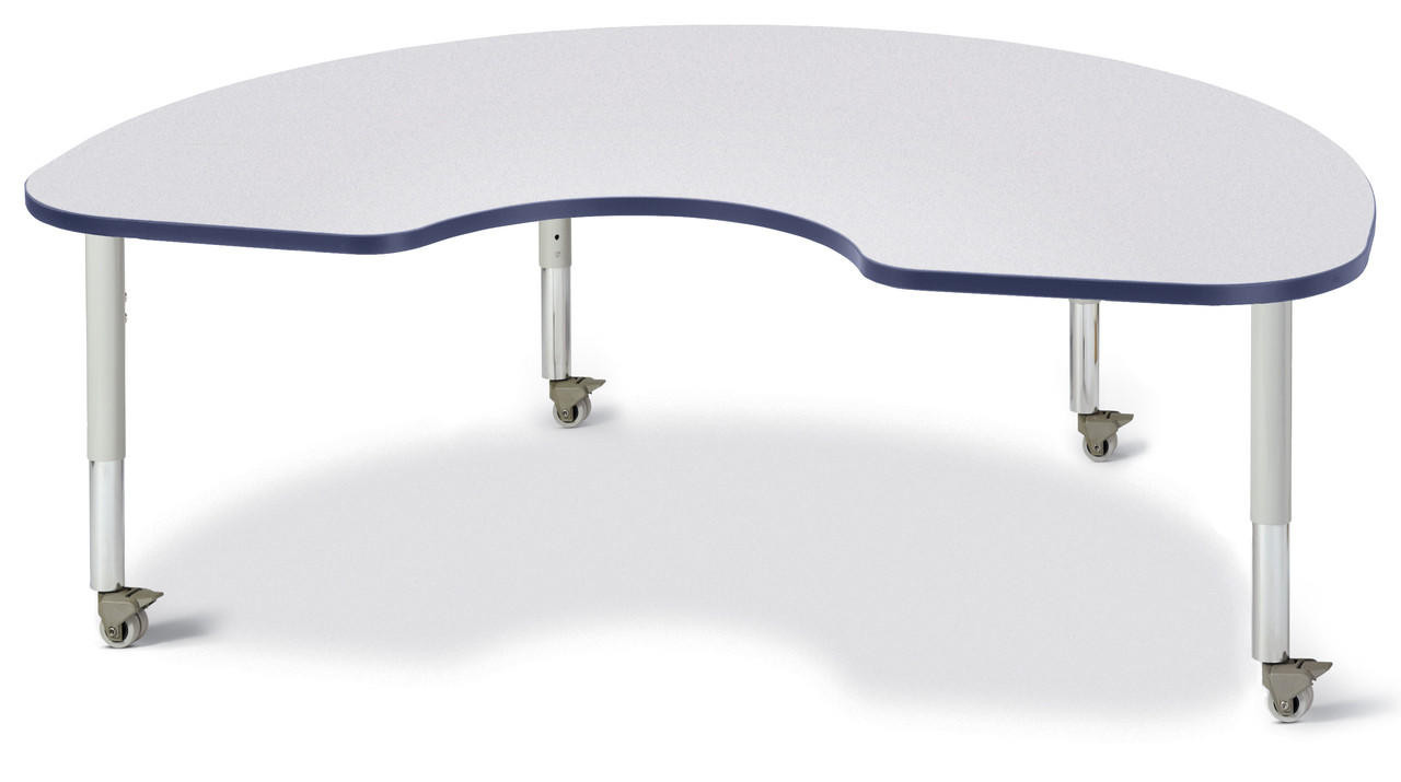 Educators can easily interact with individual children without disturbing others with Kidney Table. Accommodates up to 9 chairs. The legs adjust from 20" to 31" high, are 2" thick, and feature heavy-duty casters. Freckled gray tabletop with navy TRUEdge, gray legs, and gray casters.