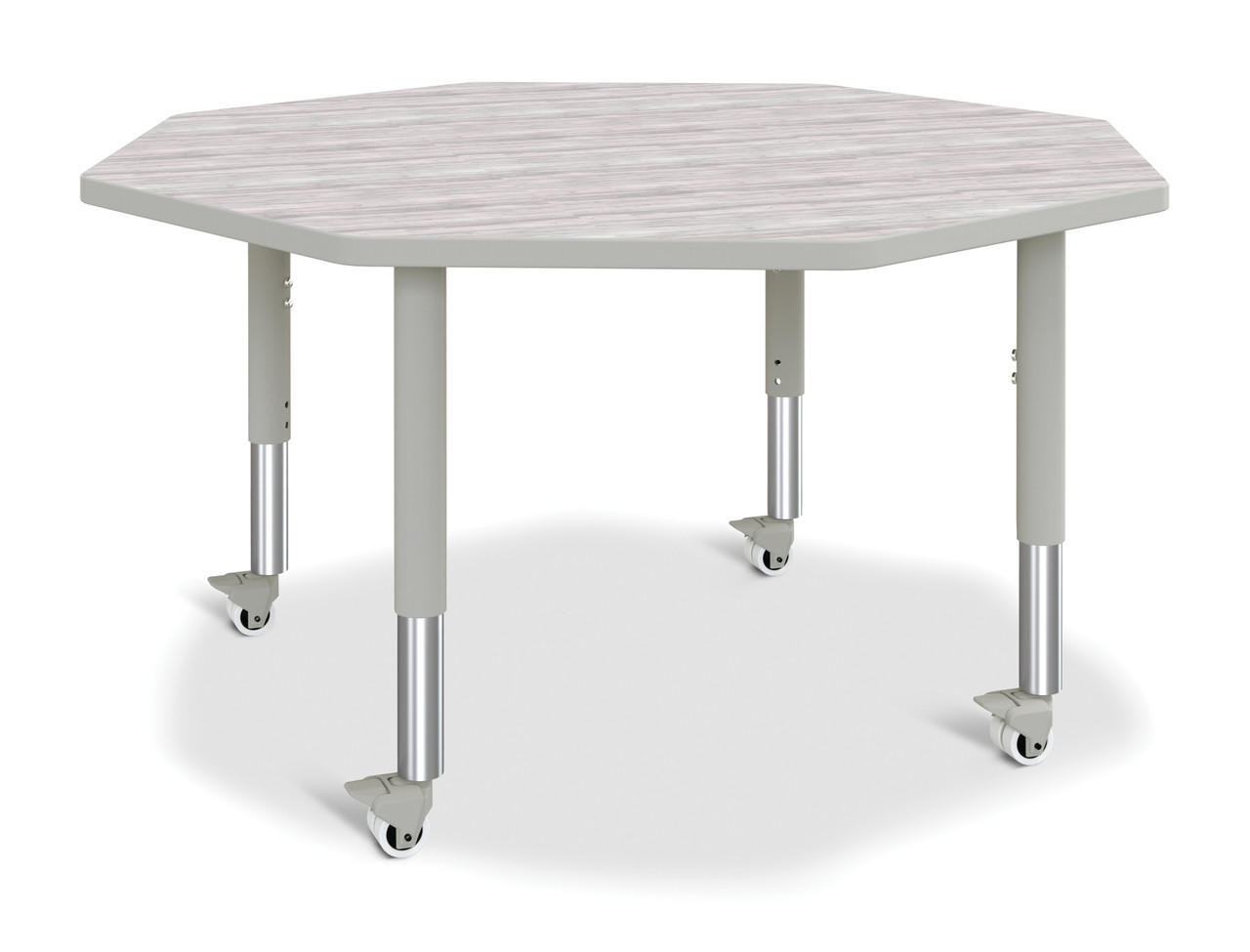 Kids will enjoy learning together while having their own space with the Octagon Table. Accommodates up to 8 chairs. The legs adjust from 20" to 31" high, are 2" thick, and feature heavy-duty casters. Driftwood Gray tabletop with gray TRUEdge, gray legs, and gray casters.