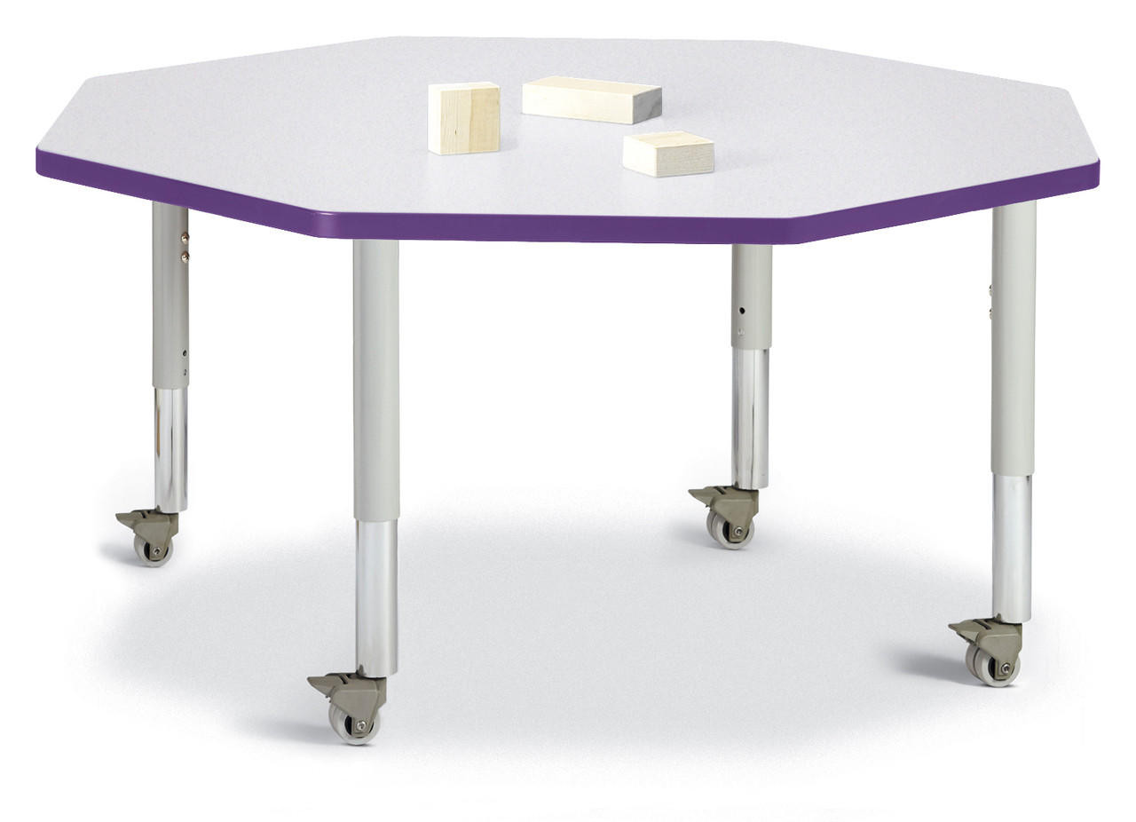 Kids will enjoy learning together while having their own space with the Octagon Table. Accommodates up to 8 chairs. The legs adjust from 20" to 31" high, are 2" thick, and feature heavy-duty casters. Freckled gray tabletop with purple TRUEdge, gray legs,