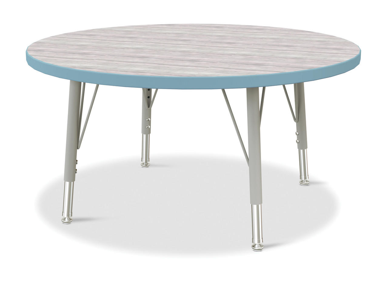 These round tables are excellent for allowing children to interact with each other during projects. Accommodates up to 4 chairs. The legs feature glides that reduce noise, prevent snags, and resist rust. Driftwood Gray tabletop with Coastal Blue TRUEdge and Gray legs.