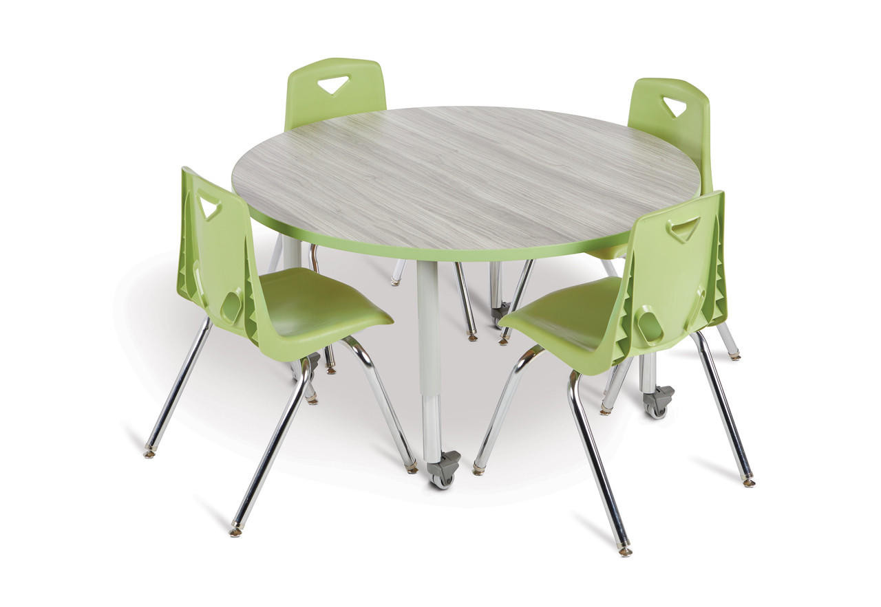 These round tables are excellent for allowing children to interact with each other during projects. Accommodates up to 4 chairs. The legs adjust from 20" to 31" high, are 2" thick, and feature heavy-duty casters. Driftwood Gray tabletop with Key Lime TRUEdge, gray legs, and gray casters.