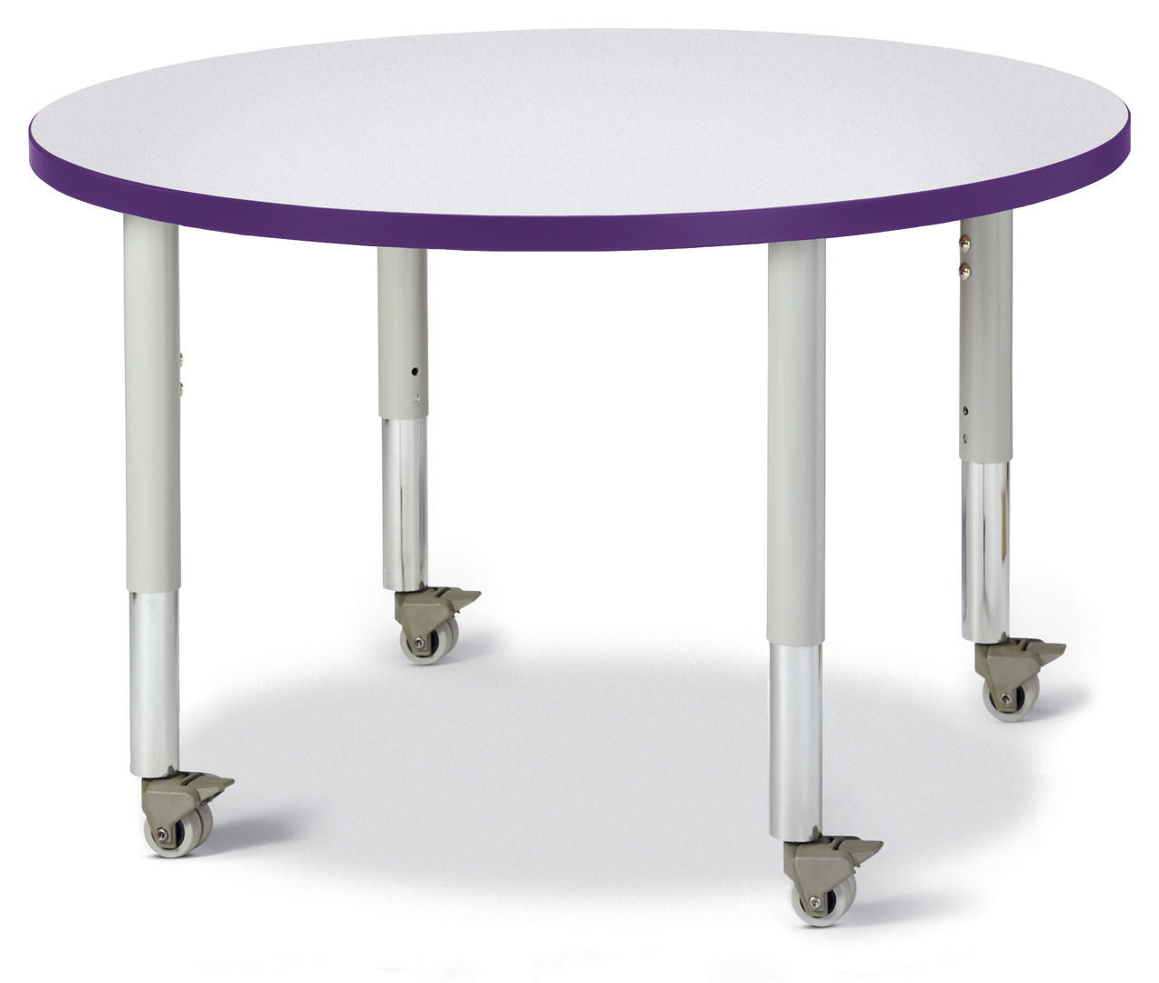 These round tables are excellent for allowing children to interact with each other during projects. Accommodates up to 4 chairs. The legs adjust from 20" to 31" high, are 2" thick, and feature heavy-duty casters. Freckled gray tabletop with purple TRUEdge, gray legs, and gray casters.
