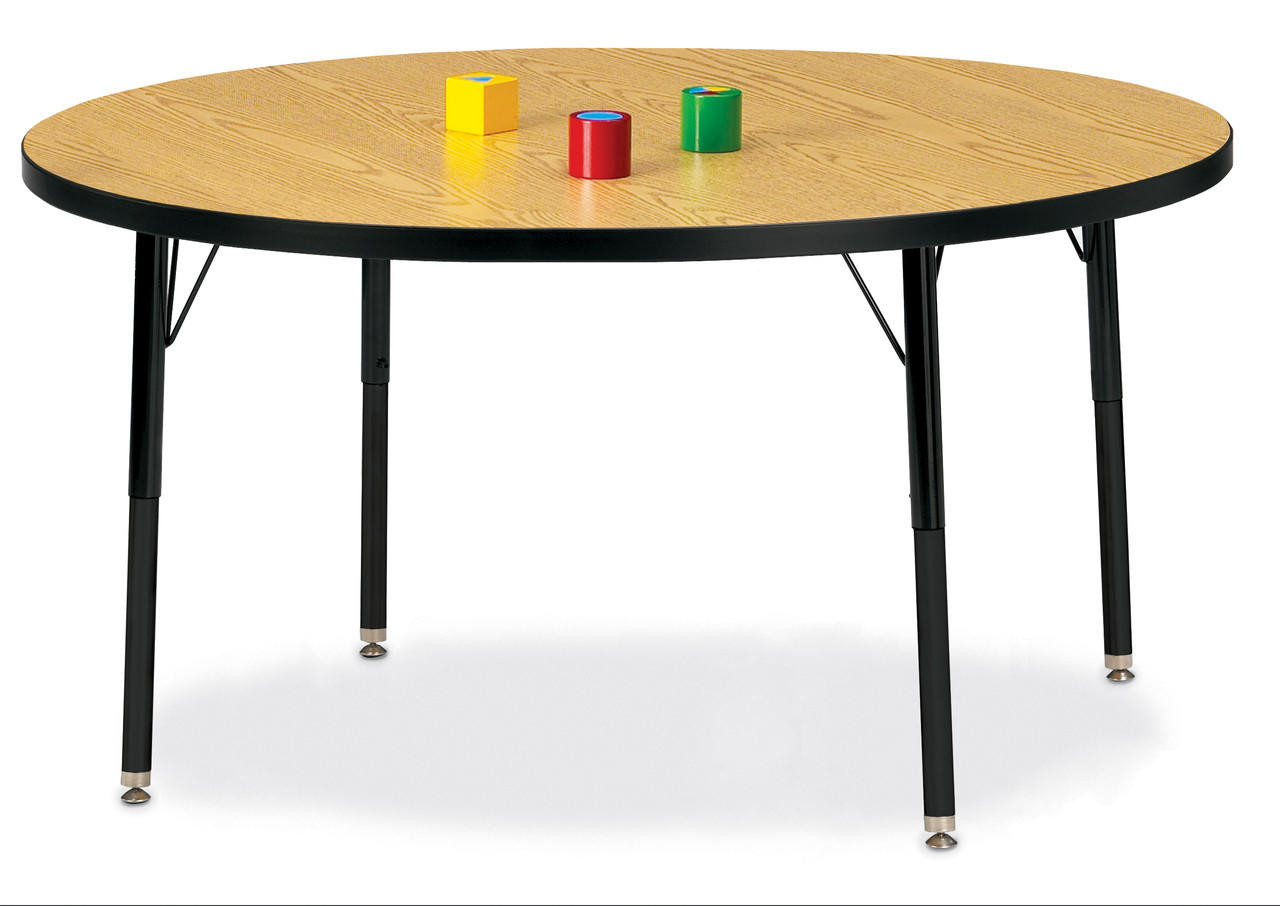 These round tables are excellent for allowing children to interact with each other during projects. Accommodates up to 6 chairs. The legs feature glides that reduce noise, prevent snags, and resist rust. Oak tabletop with black TRUEdge and black legs.