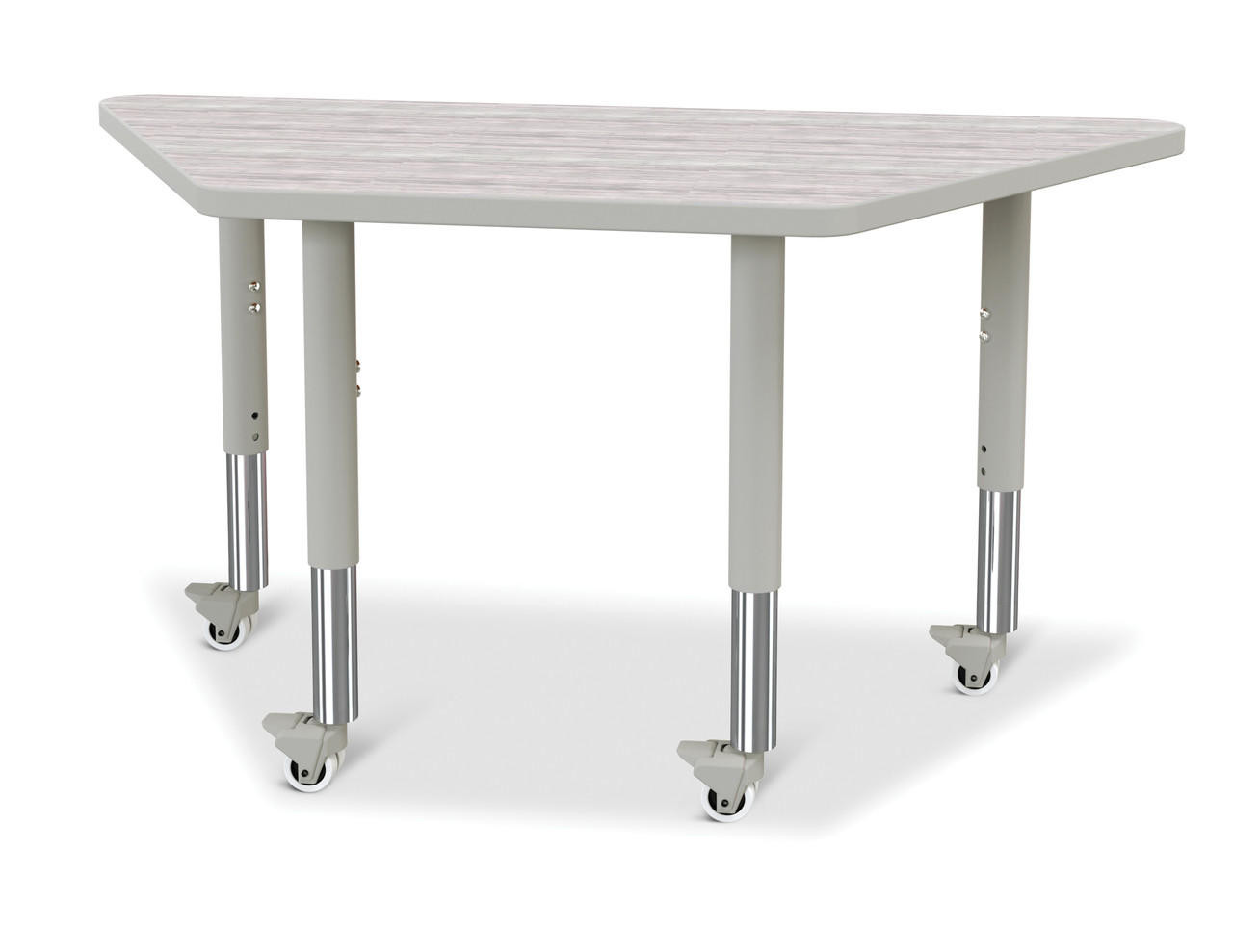Great for students of any age, multiple trapezoid tables can be arranged in many configurations to accommodate any space. Accommodates up to 5 chairs. The legs adjust from 20" to 31" high, are 2" thick, and feature heavy-duty casters. Driftwood Gray tabletop with gray TRUEdge, gray legs, and gray casters.