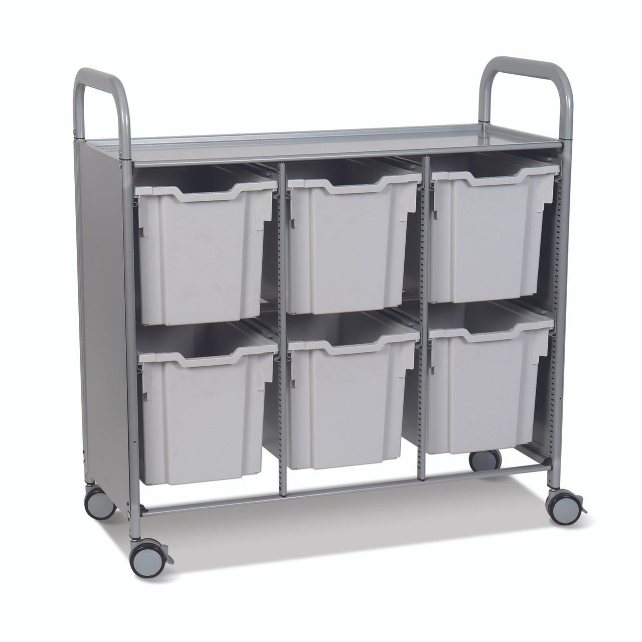 The Callero range of carts from Gratnells is specially designed with STEM and STEAM learning in mind and is suitable for collaborative learning. The Calleo Plus range is versatile, modern, secure and is perfect for transporting supplies. There are no sharp edges or corners and the ergonomic handles and 3î Casters make maneuvering the carts a breeze. All carts are compatible with Gratnells standard F type trays. The Callero carts feature an enclosed metal frame, which reduces the need for cleaning as well as offering enhanced security. StopSafe runners mean that the units are extremely secure and completely child friendly. The runners can be moved to accommodate both shallow and deep trays in one unit. Features: Large, 3î Casters for easy movement and durability. Rounded ergonomic handles for ease of control. Adjustable runners to accommodate a variety of tray sizes. Tough, powder coated frame for wear and knock resistance. Many tray inserts available to sort and segment different components. Move trays between fixed storage, classroom furniture, and the Callero cart. Sliding trays, on Stop Safe runners, allow easy access to components. Cart measures 40.2 x 16.9 x 41.5 in and includes 6 Jumbo F3 TraysQuestions about Callero Triple Cart in Silver w/ 6 Jumbo F3 Trays in Light Gray?