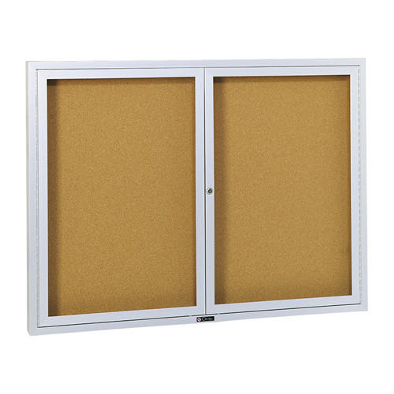 Claridge Revere Series Bulletin Board Cabinet with a Claridge Cork back panel is constructed with 1" x 3" hollow tube perimeter in a satin anodized finish. Cabinet has a hinged door with 3/16" tempered glass with a continuous piano-type hinge and a flat key tumbler lock.