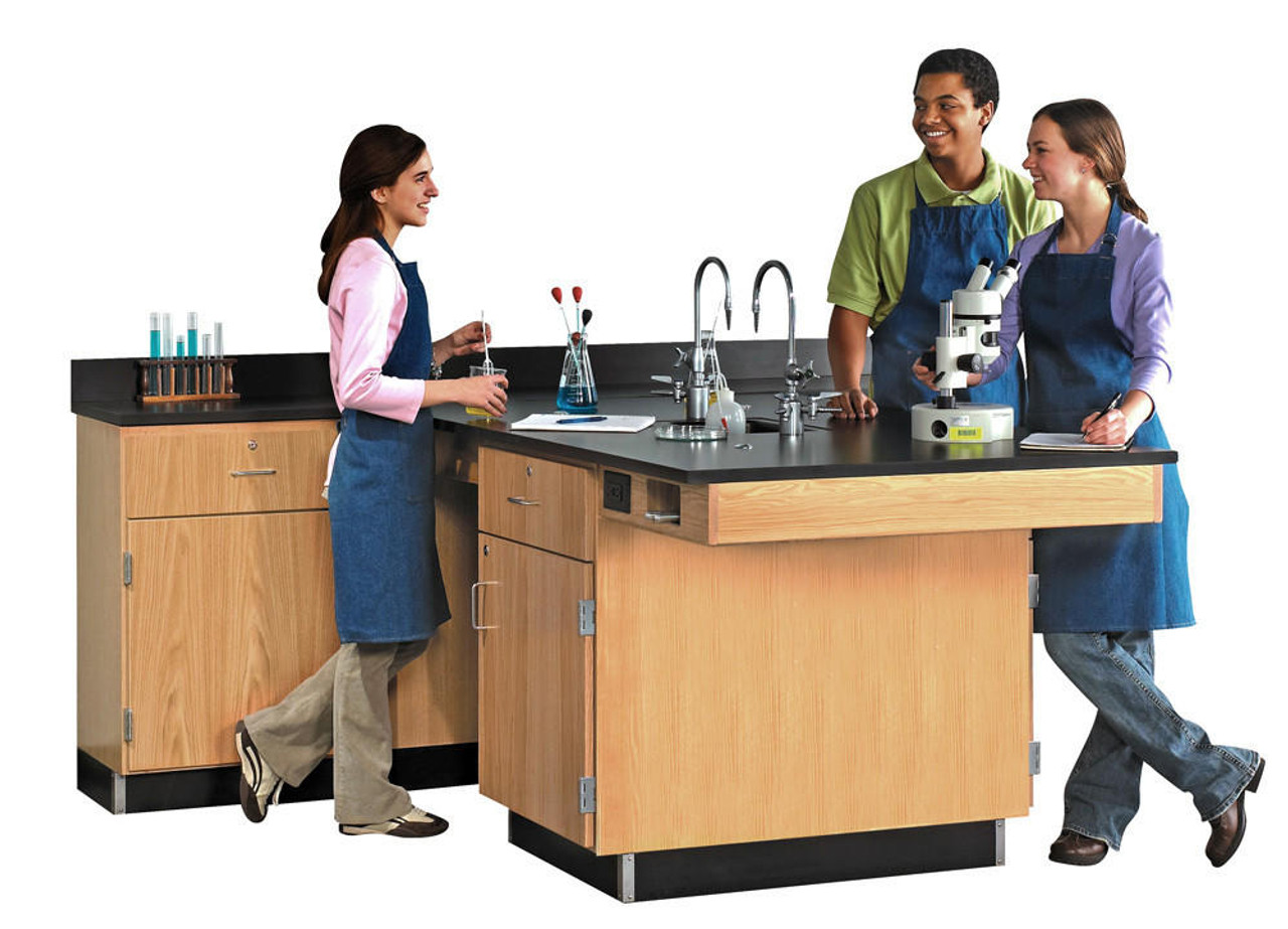Provides work space for up to four-students while storing your laboratory equipment in these perimeter workstations. Choose from 4 different configurations (see below). The four cabinets which make up a single unit measure 24"W x 16"D x 35"H. The stations are designed to utilize space along walls where they can stand alone or be ganged together. Durable solid oak and oak veneer construction finished with a chemical resistant, earth-friendly UV finish. Each unit includes: your choice of 1" epoxy resin or 3/4" phenolic resin top with back splash, solid epoxy drop-in style sink with strainer, 2 combination cold water and gas fixtures, 4 rod sockets, rod storage (rods not included), 2 GFI electrical receptacles, keyed-alike locks on all doors and dovetailed drawers and rubber base molding. Assembly and installation of electricity and plumbing is required. Sink measures: 12"W x 8"D x 6"H. Unit measures 90"W x 84"D x 36"H. Work surface on wall portion is 18"D.Questions about Diversified Woodcrafts Perimeter Workstation, 3/4" Phenolic Resin Surface, with Sink, Drawers & Cabinets?