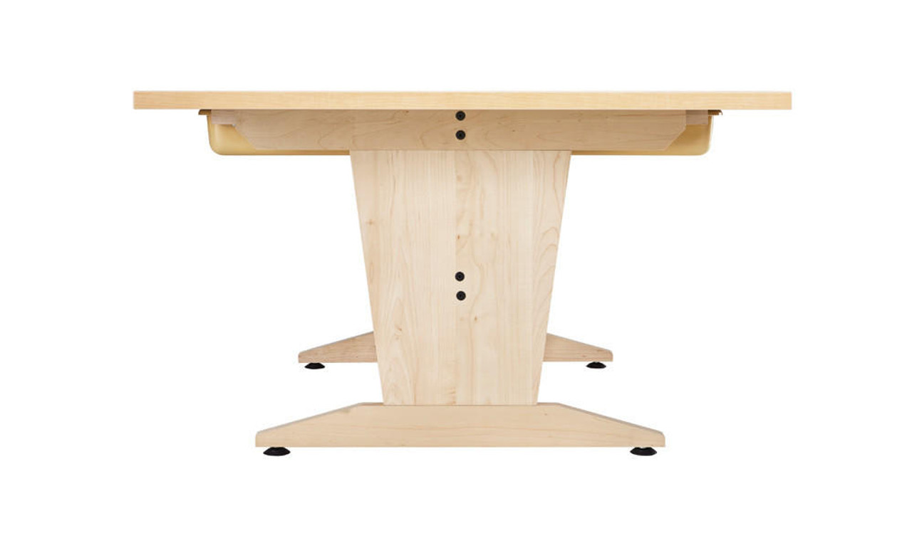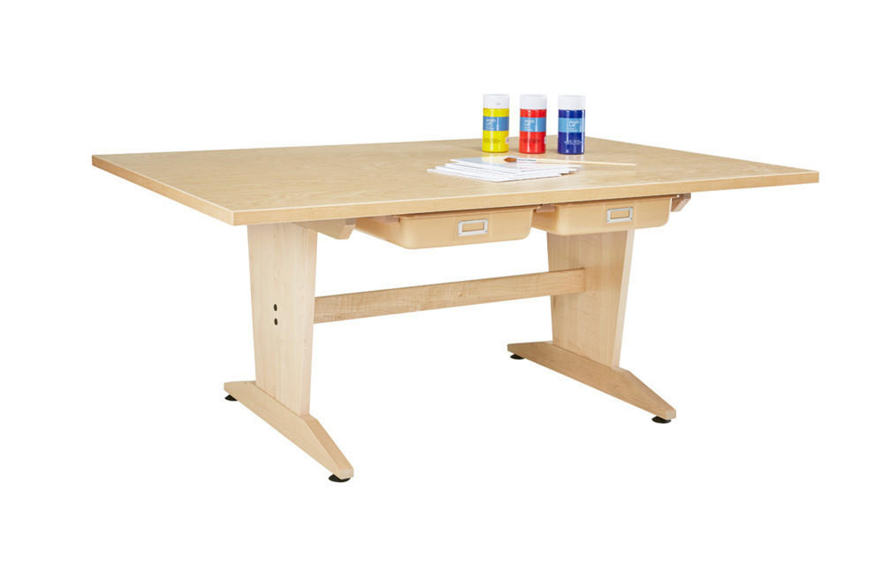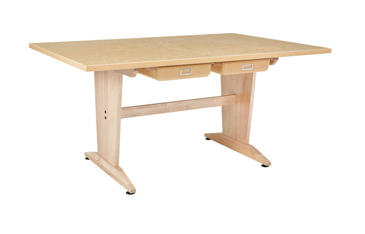 Designed to be used in most any environment from art and general planning to sewing and model construction. The base is constructed of two tapered solid maple pedestal style panel legs and two solid maple truss bars. The unique way the top is attached prevents the table from racking or rocking. The table is finished with an earth-friendly UV finish. Choose from plain, book compartment or tote tray units. Book compartment measures: 34-1/2"W x 12-1/16"D x 2-1/4"H. Each tote measures: 13-1/2"W x 19"D x 3-1/2"H. Other choices include standard height (30"H) or elementary height (26"H), and the choice of 1-3/4" solid maple top or 1-1/4" plastic laminate with 3 mm PVC edging in either birch or almond color. Overall size: 60"W x 42"D.Questions about Diversified Woodcrafts Planning Table with Tote Trays, Natural Birch?