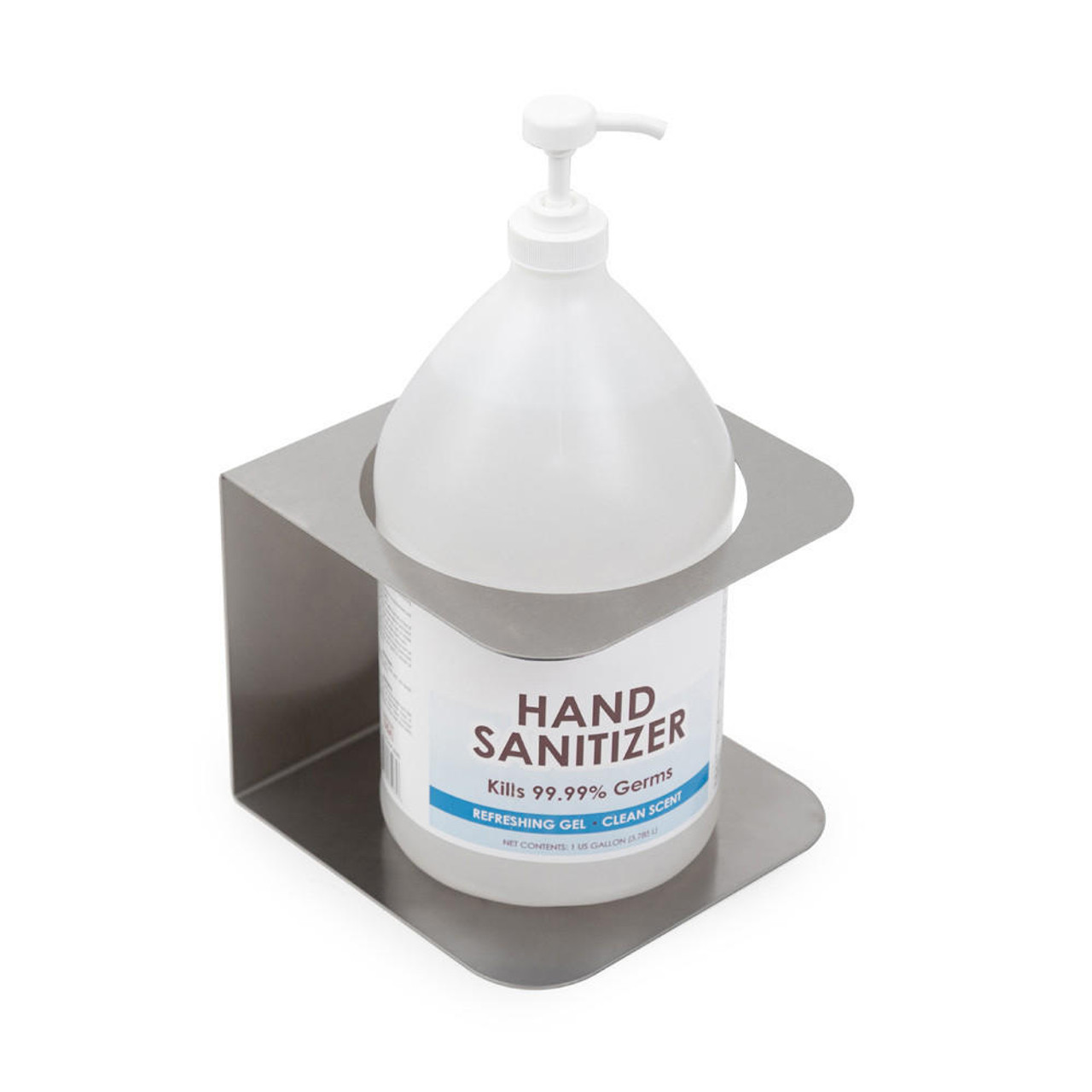 Sanitizer holder wall mount, 8"d x 8"w x 7"h with 6.5" diameter center hole, 14/300 stainless steel, holds standard gallon pump bottles of soap or hand sanitizerQuestions about Diversified Woodcrafts Sanitizer Holder Wall Mount, 8"d x 8"w x 7"h with 6.5" Diameter Center Hole?