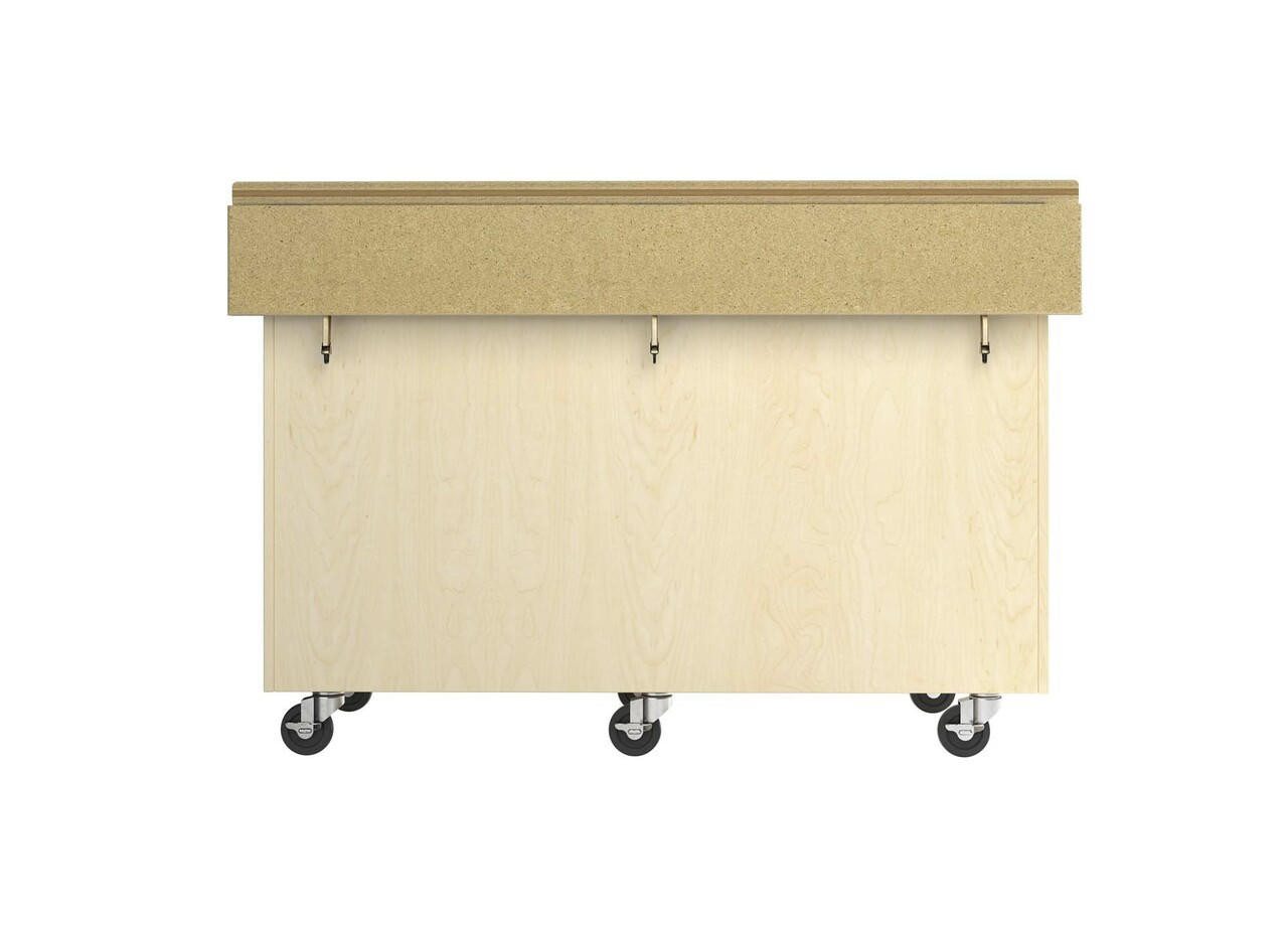 Robotic team storage solution for robots and supplies. The maple plywood workbench has two storage compartments that hold up to a 24 square robot. Also, within the compartment is a separate drawer with a customizable foam insert (included) to store tools (not included). Each compartment is outfitted to accept a combination lock. The top is ShopTop, which sandwiches a medium-density fiberboard between two layers of 1/2 high-density particleboard, creating a non-conductive and splinter proof top. The 1-1/4 ShopTop can be extended an extra 8 by raising it. Lowering the extension allows the unit to fit through doorways and moves easily on six 4 heavy-duty , locking casters. This item measures: 41.5 H x 62 W x 32 D (inches)Questions about Diversified Woodcrafts Vex-U Robotics, Robot Cabinet, Maple, 62x32?