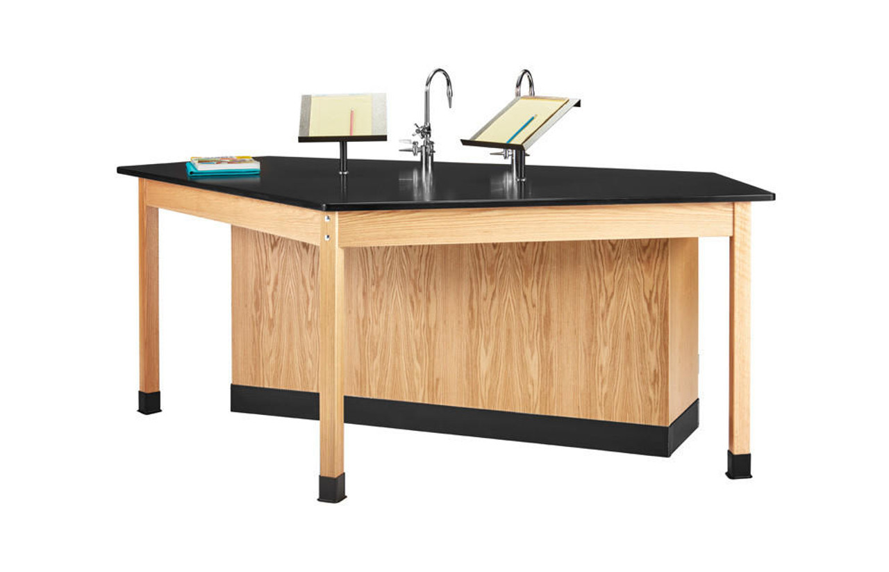 This popular workstation meets the needs of students and teachers today. The ForwardVision 4-Student Workstation allows four students to work at a single station while all are facing the teacher. The unique design leaves enough room to store four stools (not included) under the workstation. Sink units come with two combination cold water/gas fixtures. The 2916KLH and 2936KLH include two rod sockets and LabHands for holding laptop computers and books. All the units come with two GFI electrical outlets, and ample storage. Choose from two models of cabinets: Door cabinet with two adjustable shelves or the door/drawer cabinet with one adjustable shelf and a drawer. The stations are finished with a chemical resistant, earth-friendly UV finish. All doors and drawers lock. Dimensions: 96"W x 50"D x 36"H.