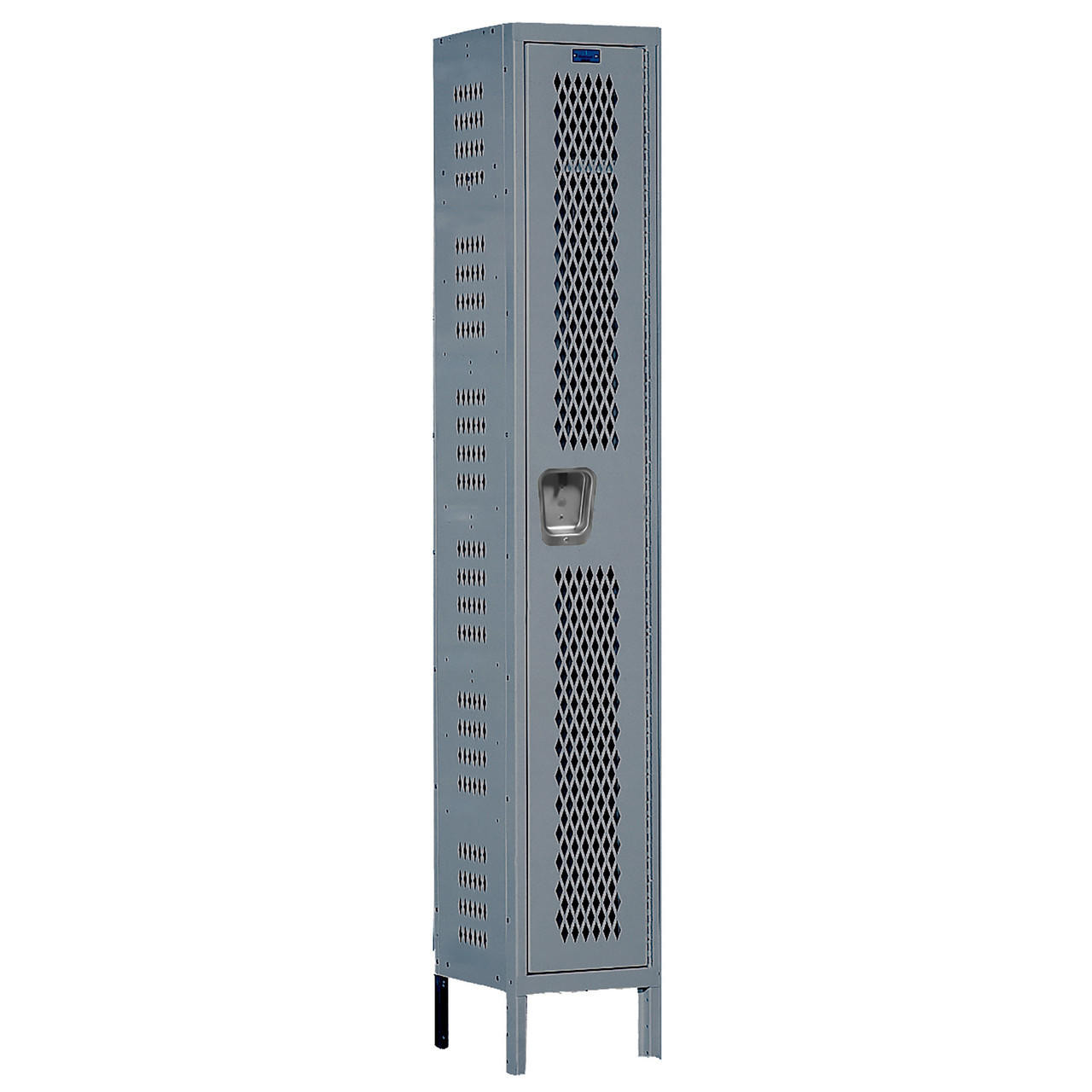 Hallowell Heavy-Duty Ventilated (HDV) Locker, 12"W x 15"D x 78"H, Single Tier, 1-Wide, Assembled. Ventilated doors and sides. Heavy guage door body. Large capacity sizes available. Strength and ventilation in one practical locker. BODY CONSTRUCTION: Knock-down, 16 gauge body with 18 gauge back. Sides are diamond perforated for maximum ventilation. BODY STYLES: Single, double and six tier. DOOR: 14 gauge, diamond perforated for maximum ventilation. HINGES: Continuous piano type. HANDLE (wardrobe): Stainless steel recessed handle with multi-point gravity lift-type latching. Recessed handle protects finish from being marred by padlock. HANDLE (box): Box lockers include a projecting single-point friction catch door pull prepared for both padlock or built-in lock. No moving parts insures quiet maintenance-free locker operation. HOOKS: One double prong ceiling hook and two single hooks per single and double tier locker opening. One double ceiling hook for triple tier. COAT RODS: Available for single tier at a nominal cost. SHELVES: Hat shelf is included in single tier lockers. LEGS: 6" high legs are standard. Lockers without legs are available for a nominal charge.