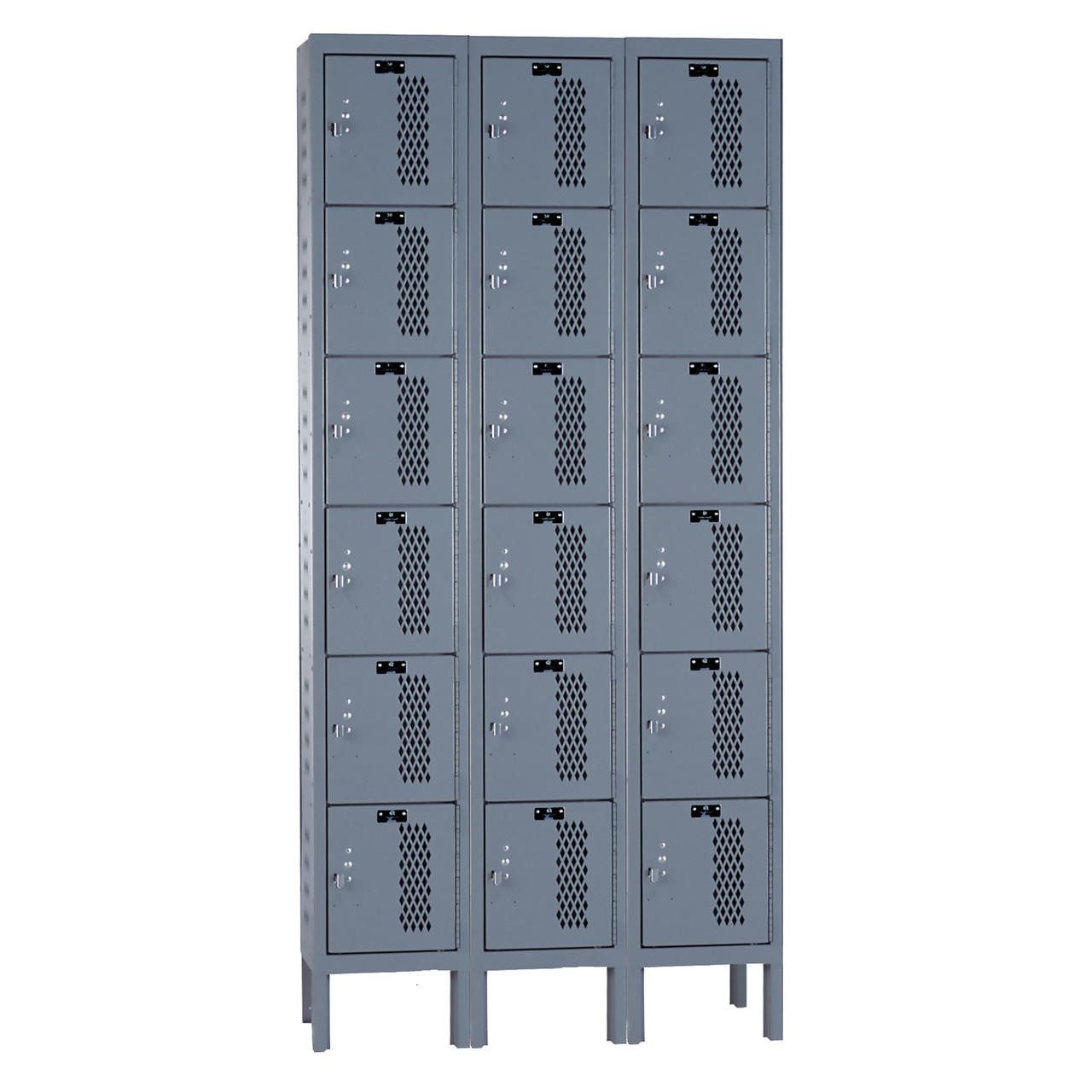 Hallowell Heavy-Duty Ventilated (HDV) Locker, 36"W x 12"D x 78"H, Six Tier, 3-Wide, Assembled. Ventilated doors and sides. Heavy guage door body. Large capacity sizes available. Strength and ventilation in one practical locker. BODY CONSTRUCTION: Knock-down, 16 gauge body with 18 gauge back. Sides are diamond perforated for maximum ventilation. BODY STYLES: Single, double and six tier. DOOR: 14 gauge, diamond perforated for maximum ventilation. HINGES: Continuous piano type. HANDLE (wardrobe): Stainless steel recessed handle with multi-point gravity lift-type latching. Recessed handle protects finish from being marred by padlock. HANDLE (box): Box lockers include a projecting single-point friction catch door pull prepared for both padlock or built-in lock. No moving parts insures quiet maintenance-free locker operation. HOOKS: One double prong ceiling hook and two single hooks per single and double tier locker opening. One double ceiling hook for triple tier. COAT RODS: Available for single tier at a nominal cost. SHELVES: Hat shelf is included in single tier lockers. LEGS: 6" high legs are standard. Lockers without legs are available for a nominal charge.
