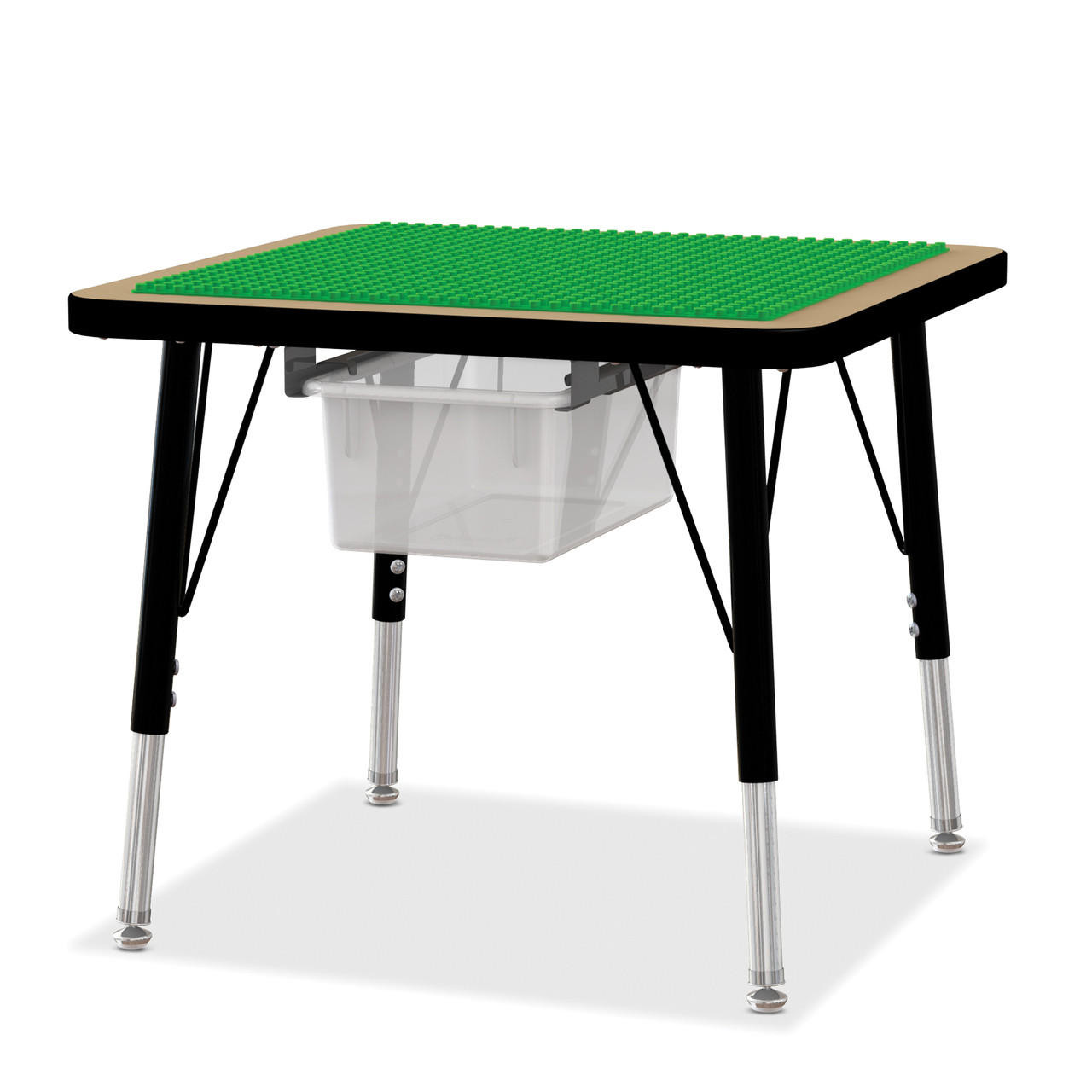 Your preschoolers will love this building table to learn creativity, problem solving, and persistence. The table features one 20" x 20" preschool brick compatible base plate. This plate is permanently mounted to a tan laminate tabletop that is wrapped with black TRUEdge. The adjustable black legs make it easy to raise and lower the table from 15"H to 24" high depending on your children's needs. The tabletop is large enough to accommodate multiple children at one time, but small enough to fit in an activity area. Plus, we've designed the table so you can easily add a 6398JC Store-It Rail Kit and Cubbie-Tray for brick storage. Lego or Duplo are trademarks of the LEGO Group, which does not sponsor, authorize, or endorse this product.