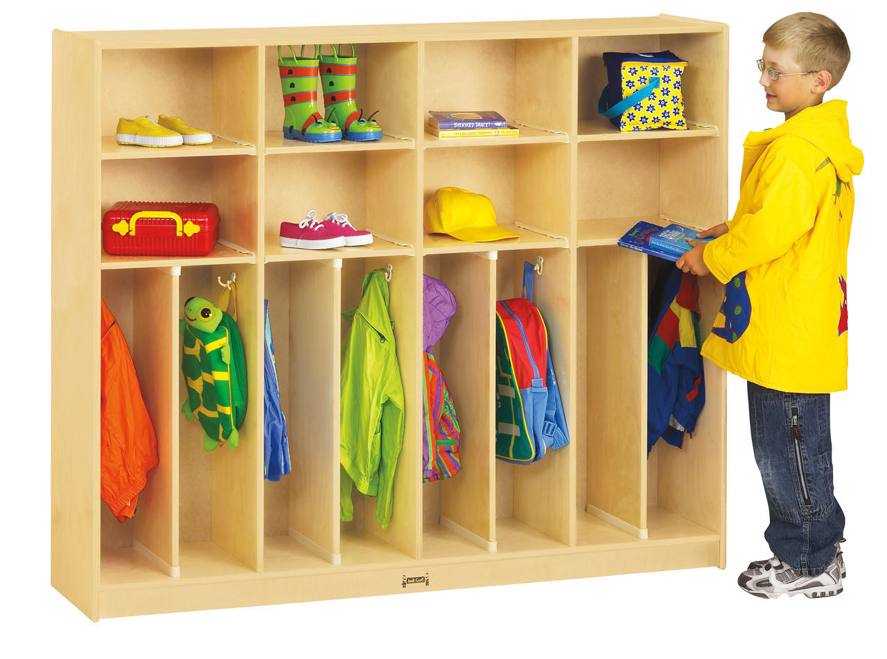 Eight locker sections in small space! One double coat hook is side mounted in each of the eight lockers for hanging jackets and bags. Eight open compartments above are great for storing hats and lunchboxes.