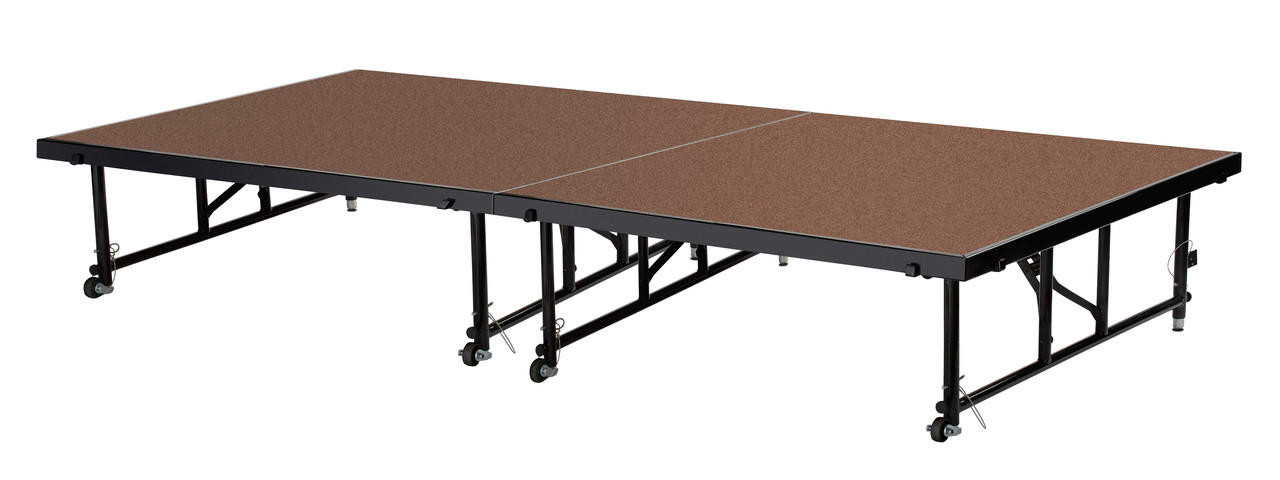 The Transfix is an expansion to our popular performing arts line of stages featuring 4"x4" sized platforms that are height adjustable from 16-24" or 24-32", and roll on caster wheels. Available in both hardboard and a variety of carpeted surfaces, these new lighter weight portable platform pieces are the perfect solution for when one person will be doing the setup. Roll to desired location on built in caster wheels and gang together multiple platforms to create large or small stages of your choosing.