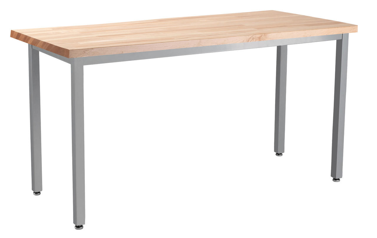 The NPS Heavy Duty Table with Butcher Block Top is the ideal working table for Makerspaces and STEM Labs. The Butcher Block top is made from 1.75" thick Maple wood coated with a urethane-based satin finish to prevent permanent stains. Maple top absorbs sound and impact, making for a safe learning environment. 16 gauge steel frame apron and 14 gauge legs make this table virtually indestructible. The 11 gauge steel tabletop support tabs and corner brackets fuse as one with 4 heavy-duty tamper-free Loctite hex screws. The steel legs feature a supreme dual connection. The (12 gauge) leg-base is fastened to the tabletop with 4 heavy-duty screws which gets inserted into the frame using a strong welded hangar bolt. Legs connect to the frame corner brackets with industrial-grade nylon-insert lock nuts. All legs come standard with simple-adjust glides with optional caster/gusset kits. Durable wood and hard work come together in the NPS Butcher Block Top Heavy Duty Table.
