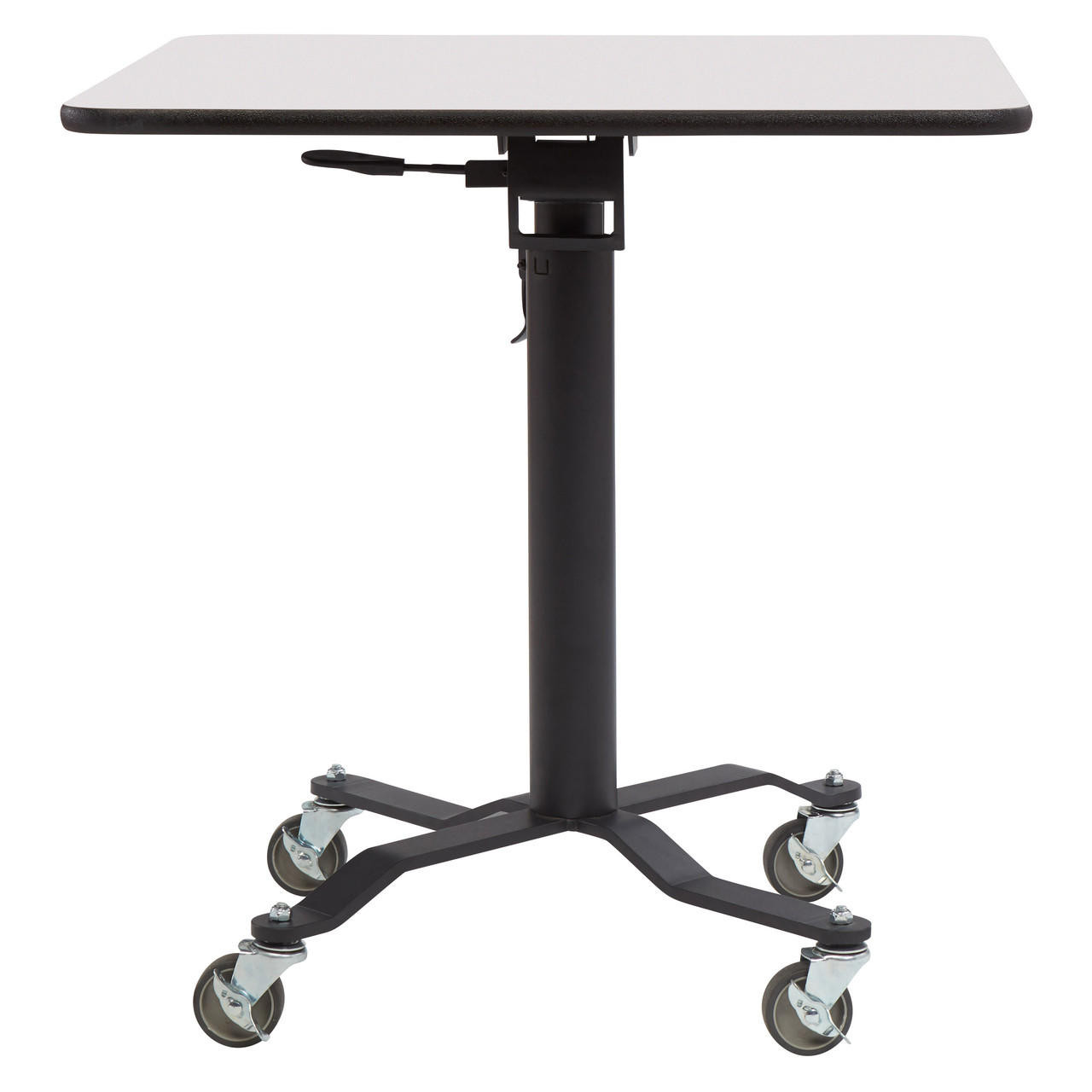 The New Premium Plus Cafe Table from NPS combines modern design with superior strength and functionality. Our whiteboard tabletops are easy to clean and will resist scratches. Available in square shapes in 30" size tops. Tables adjust from 30" to 42" using a smooth and easy to adjust pneumatic lever. The heavy-duty 13 gauge steel column and _ inch steel base is securely fastened onto 3" Heavy-Duty Polyurethane non-marring locking swivel casters, providing a secure base which safely rolls to your desired location. The table top folds and locks into place and can be nested with other tables for safe compact storage. Meeting all TSCA title VI requirements. Turn your Cafeteria into a Cafe dining experience.