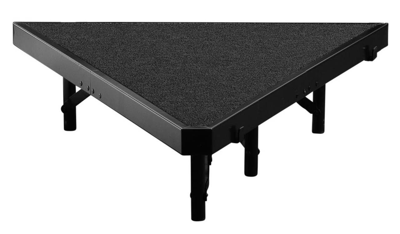 The NPS Portable Carpeted Stage Pie is used to create customized bow, oval or ring-shaped configurations. It's the reliable and affordable choice for your school performances and assemblies. Users are supported by a heavy-duty, 16-gauge steel, black powder-coated frame. The premium 3/4" thick plywood deck is durable and features a firmly-affixed carpeted surface. Legs are constructed with 14-gauge steel tubing and feature simple and safe spring-loaded locking mechanisms allowing for quick set-up assembly and folds up easily for manageable portable storage. The stage offers a secure weight capacity of over 200 lbs. per square foot. High-impact plastic glides will ensure floors are protected from damage. Firmly welded ganging devices let users combine equal-height stages to create a large single stage platform or assemble different sizes to create choral or band riser configurations. Ships fully assembled.