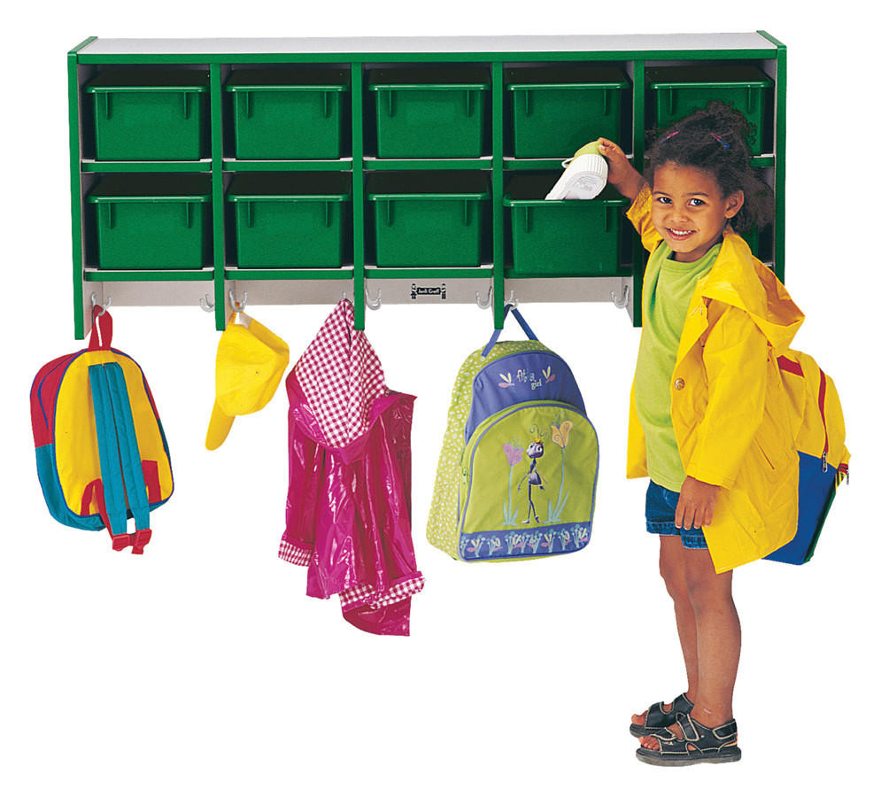 No floor space? No problem! This wall hanging locker is perfect! Ten cubbie-tray openings and ten double coat hooks provide space for children's books, bags, coats, and more!