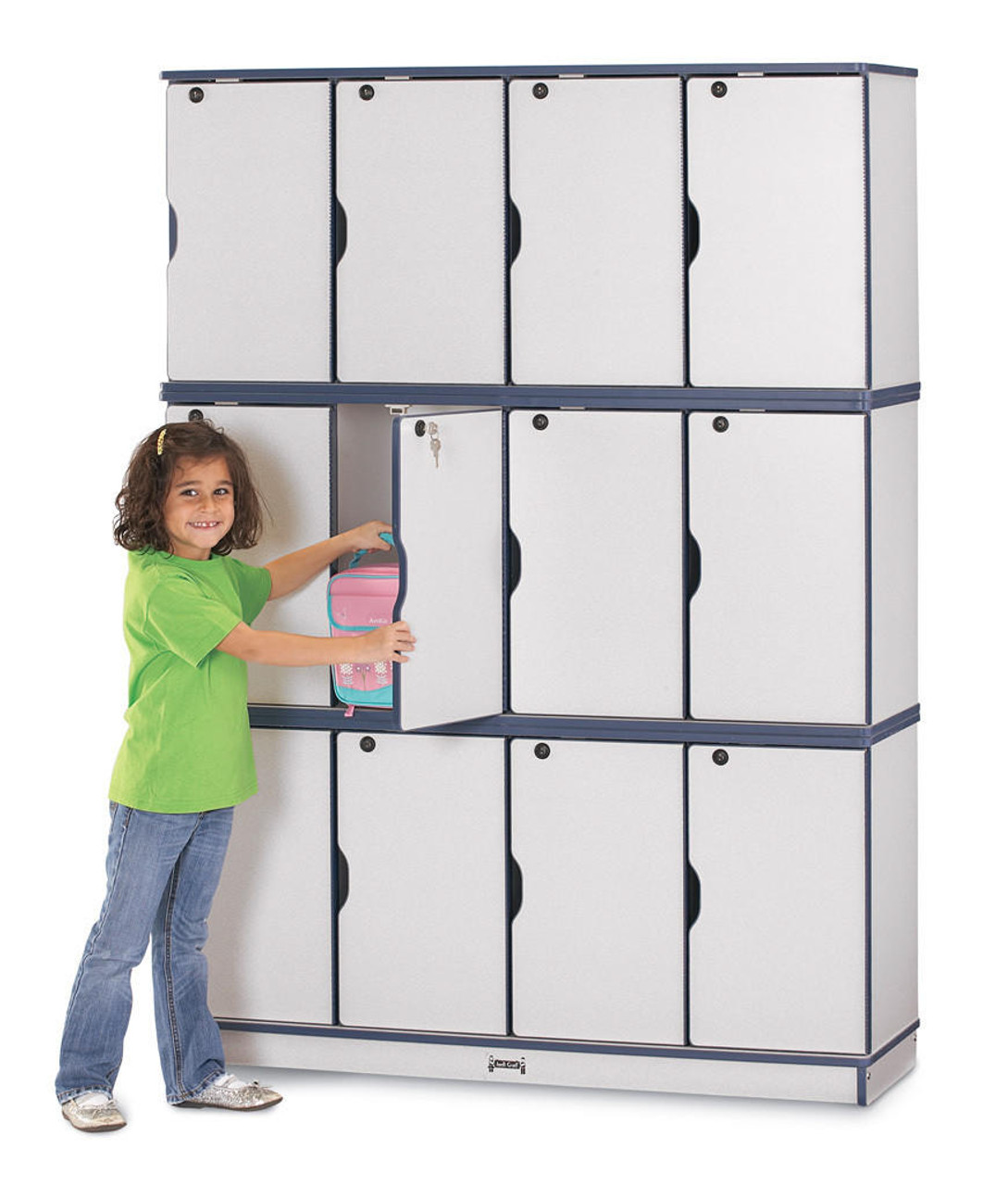 Provide maximum storage space for backpacks and other items with this triple stack of lockers featuring 12 individual lockers. Different locks and keys for secured lockers. Individual lockers are 10.5" wide x 12.5" deep x 20" high. Stacked lockers must be fastened to a wall. Note: The unit has four small holes and threaded inserts through the top for stacking units.