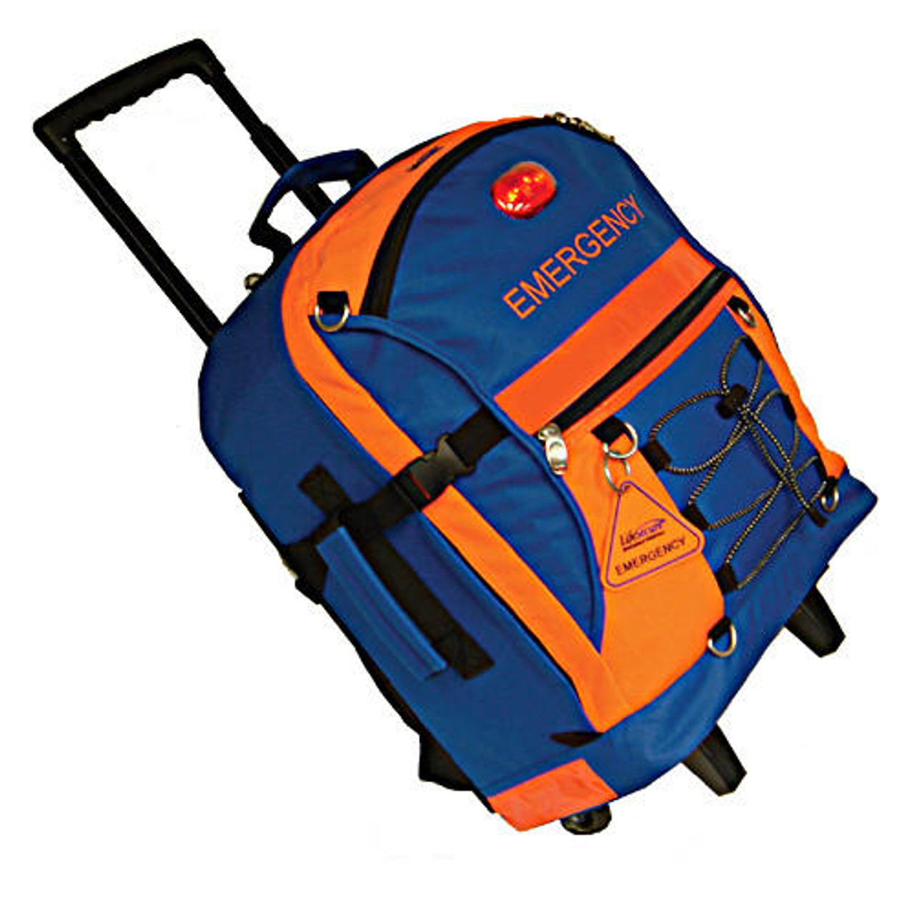 SecurEvac Easy-Roll Emergency Backpack. The bright colored heavy duty emergency SecureEvac Easy-Roll SecureEvac Easy-Roll Backpack with LED Safety Signal is designed for storage and hands free carrying of your LifeSecure emergency supplies. The 3-LED Safety Signal (2 AA batteries not included) ensures safe travel and easy identification. As response to a disaster may mean that you need to leave home, it is important that you store your emergency supplies in a bag or container that is easily identifiable and transported. Each family member should have their own carrying?bag with supplies in case of accidental or planned separation. Durability, protection and comfort. This rugged SecureEvac Easy-Roll Backpack is made of durable 600 Denier Polyester to provide tough protection for your emergency supplies. Comfortable, padded shoulder straps are adjustable with heavy stitching for durability. Back panel is padded for comfortable carrying. Heavy duty ergonomic zippers are protected by doubled covering to help keep dirt and moisture out. Convenience and Organization. Top grab loop handle allows for quick one handed transport. Double zipper on the main compartment provides easy access. Second pocket helps organize contents. Adjustable utility strap holds 3-LED Safety Signal or secures other supplies. Two additional utility loops allow for securing ID tag (not included) and other supplies. Safety. 3-LED Safety Signal (2 AA batteries not included) with flashing and continuous beam modes emits a super bright beam that can be seen up to 2,500 feet. Attached to the SecureEvac Easy-Roll Backpack, it provides strong visibility to approaching vehicles and helps keep track of family members while traveling on foot. Signal can be removed from SecureEvac Easy-Roll Backpack and worn using the convenient belt clip. Can be used to signal for help. Dimensions and weight: 17 x 13 x 5.5, 5 lbs.Questions about SecureVac Easy Roll Backpack?